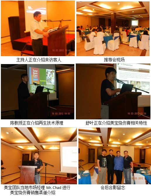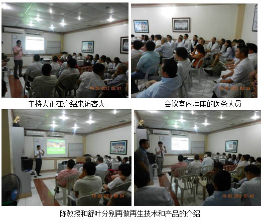 2012年3月15日早上10點(diǎn),在當(dāng)?shù)厝藛T帶領(lǐng)下,美寶團(tuán)隊(duì)走訪了Cebu城市幾個(gè)大型的政府或私立醫(yī)院,這幾家大型醫(yī)院正在嘗試使用再生技術(shù)和產(chǎn)品。其中,Dr. Mirela是重點(diǎn)培養(yǎng)的醫(yī)生,她是當(dāng)?shù)谻ebu City Medical Center(宿務(wù)市醫(yī)療中心)主管院長,她于去年6月到四川學(xué)習(xí)再生醫(yī)療技術(shù)兩周時(shí)間,深入了解到再生療法在中國的使用情況并學(xué)到了純正的再生技術(shù)?;貒螅e極致力于再生技術(shù)在當(dāng)?shù)氐氖褂?。通過她個(gè)人的影響力安排中國專家在當(dāng)?shù)卣瓮饪评龝?huì)上正式推廣再生技術(shù)及產(chǎn)品。晚上7:40,宿務(wù)整形外科例會(huì)按時(shí)召開,當(dāng)?shù)馗骷?jí)別整形醫(yī)生共計(jì)44人參加了此次例會(huì)。陳永翀教授為大家講授再生醫(yī)學(xué)臨床使用方法,舒葉介紹美寶燒傷膏產(chǎn)品知識(shí),整個(gè)例會(huì)持續(xù)了近3個(gè)小時(shí)。在最后的提問環(huán)節(jié),與會(huì)醫(yī)生就再生醫(yī)學(xué)相關(guān)問題同美寶團(tuán)隊(duì)成員進(jìn)行了深入的交流。最后Dr. Mirela總結(jié)說,她非常感謝中國客人的到來,但更要感謝的是帶來了這么完美的技術(shù),她本人在中國學(xué)習(xí)了兩周,親眼見證了再生技術(shù)在中國的神奇應(yīng)用,現(xiàn)在有很多她的病人都在這項(xiàng)技術(shù)的幫助下康復(fù),非常感激那次的學(xué)習(xí)旅程,使她見識(shí)到了不僅中國人的熱情還有中華民族強(qiáng)大的醫(yī)學(xué)文化底蘊(yùn)。