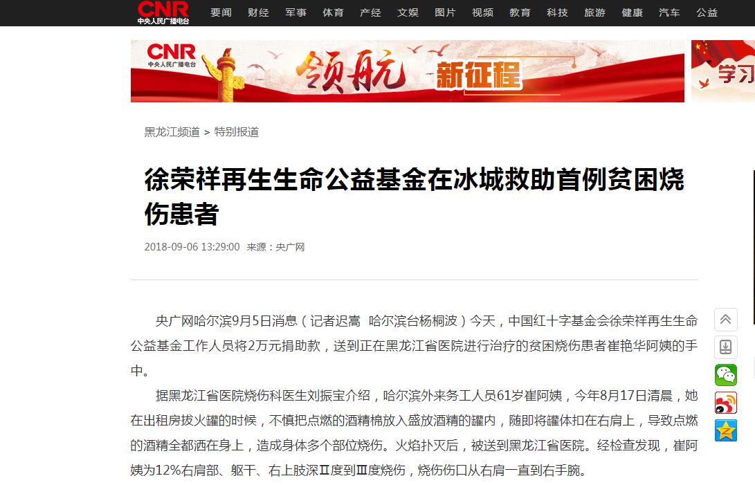 央廣網(wǎng)哈爾濱9月5日消息(記者遲嵩  哈爾濱臺(tái)楊桐波)今天,中國(guó)紅十字基金會(huì)徐榮祥再生生命公益基金工作人員將2萬元捐助款,送到正在黑龍江省醫(yī)院進(jìn)行治療的貧困燒傷患者崔艷華阿姨的手中。