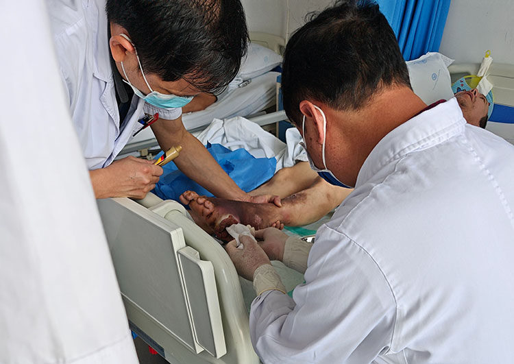 5月27日,《中國燒傷創(chuàng)瘍雜志》常務(wù)編委、燒傷創(chuàng)瘍?cè)偕t(yī)療技術(shù)臨床專家趙瑞慶,應(yīng)南京南鋼醫(yī)院(南京德馭康養(yǎng)中心)邀請(qǐng),在外科病區(qū)會(huì)診了五例慢創(chuàng)患者(糖足2例、壓瘡2例、下肢脈管炎1例)。在討論環(huán)節(jié)分別釆取一病一策的治療方法,最后將最新治療糖尿病足改善血液循環(huán)的方法傳授于當(dāng)?shù)蒯t(yī)務(wù)人員,大家表示受益匪淺。