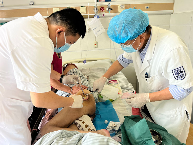 2025年5月23日,應(yīng)海安市中醫(yī)院、如皋市中醫(yī)院之邀,《中國燒傷創(chuàng)瘍雜志》常務(wù)編委、燒傷創(chuàng)瘍?cè)偕t(yī)療技術(shù)臨床專家趙瑞慶,經(jīng)過前期兩周的術(shù)前準(zhǔn)備,為一例因車禍造成左下肢截肢術(shù)后2個(gè)月殘端環(huán)形創(chuàng)面未愈合患者行”皮簇種植術(shù)”,術(shù)后病人安返病區(qū)。下午,趙教授又前往如皋中醫(yī)院會(huì)診了二例糖尿病潰瘍患者,受到全體醫(yī)護(hù)人員的一致好評(píng)!