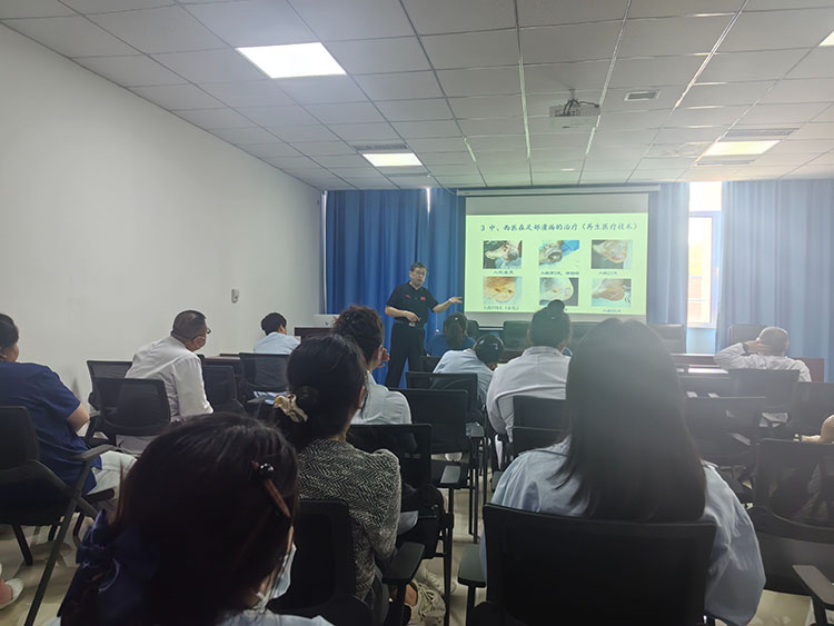 5月28日,《中國燒傷創(chuàng)瘍雜志》常務(wù)編委、燒傷創(chuàng)瘍?cè)偕t(yī)療技術(shù)臨床專家趙瑞慶,應(yīng)邀在溧水區(qū)人民醫(yī)院舉辦了一期再生技術(shù)科室培訓(xùn),講解了《再生技術(shù)治療糖尿病足潰瘍》《再生技術(shù)救治急性外傷創(chuàng)面的臨床使用》講座,在會(huì)上解答了大家提出諸多的臨床問題。會(huì)后深入病區(qū)會(huì)診了二例慢創(chuàng)患者,本次再生技術(shù)走基層活動(dòng)受到當(dāng)?shù)蒯t(yī)務(wù)人員的熱情稱贊。