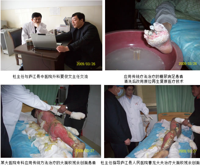 杜主任每到一家醫(yī)院利用電腦幻燈片資料詳細(xì)地介紹了皮膚原位再生復(fù)原醫(yī)療技術(shù)的臨床應(yīng)用及國內(nèi)外推廣情況,以及臨床療效和最新研究成果。并介紹了5.12四川大地震中應(yīng)用皮膚原位再生復(fù)原醫(yī)療技術(shù)及皮膚再生復(fù)原醫(yī)療新產(chǎn)品速愈貼的臨床療效,引起了廣泛的社會效應(yīng),黨和國家給予肯定和表彰。在安慶海軍116醫(yī)院舉辦的外一、外二、骨科學(xué)術(shù)講座中收到良好效果,醫(yī)護(hù)人員積極認(rèn)真參加學(xué)習(xí),并先后和醫(yī)務(wù)處胡以法主任(蒹外科主任)、劉永慶主任、王啟懷主任進(jìn)行座談交流。