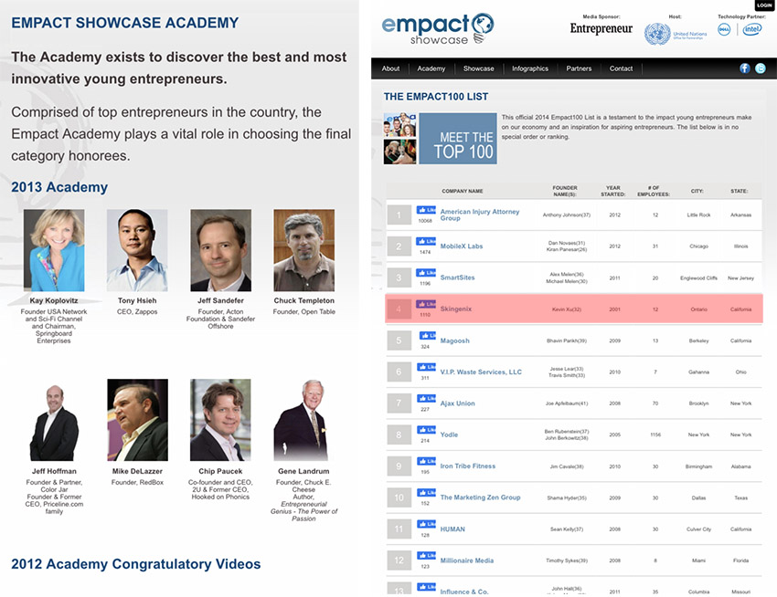 2014年,謝家華是聯(lián)合國(guó)Empact100大獎(jiǎng)六位核心評(píng)選人之一,他非??粗孛缹歋KINGENIX公司,力挺SKINGENIX公司在Empact Showcase中脫穎而出,位列第四。他重視年輕企業(yè)家的力量及在解決世界緊迫問(wèn)題上所扮演的角色,他鼓勵(lì)有抱負(fù)的青年企業(yè)家發(fā)揮企業(yè)家精神,為這個(gè)社會(huì)帶來(lái)更深厚的經(jīng)濟(jì)及社會(huì)改變。徐鵬當(dāng)時(shí)兼任SKINGENIX總裁,獲得了聯(lián)合國(guó)2014EMPACT100大獎(jiǎng)。
