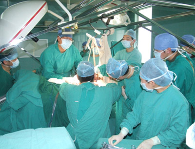 3月1日上午8點(diǎn),我院手術(shù)室里一片繁忙景象,經(jīng)過醫(yī)護(hù)人員1個(gè)半小時(shí)的努力,克服了巨大腫瘤造成的困難,術(shù)前患者體位合適,麻醉成功。9點(diǎn)50分,手術(shù)正式開始,由我院整形燒傷科趙賢忠主任與上海長(zhǎng)征醫(yī)院整形外科江華主任共同主刀,麻醉由經(jīng)驗(yàn)豐富的顧仁勇主任和邢春花主任主持,陳松院長(zhǎng)親臨現(xiàn)場(chǎng)協(xié)調(diào)。為了便于手術(shù),腫瘤被特制的布兜懸吊于半空,布兜的兩端被固定在專門為這次手術(shù)特制的手術(shù)架上。專家們?cè)谥值呐浜舷?,按照預(yù)定方案切開皮膚,沿著腫瘤邊緣小心分離,對(duì)腫瘤根部粗如手指的血管仔細(xì)分離、鉗夾、切斷、雙重結(jié)扎,憑借著嫻熟的技術(shù),僅僅3個(gè)小時(shí)后,折磨患者達(dá)15年之久的腫瘤就被完整地切除下來,流失液分的腫瘤就像一只匍匐著的海豹。接下來的任務(wù),是如何更好的修復(fù)創(chuàng)面,同時(shí)避免新的創(chuàng)面形成。
