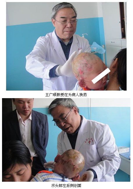 樂(lè)陵市人民醫(yī)院燒傷科于2011年4月25日接收了1名頭皮沸油燒傷小兒患者,該院高院長(zhǎng)、燒傷科吳主任非常重視,與燒傷科魯國(guó)軍醫(yī)生一同為患兒采用再生醫(yī)療技術(shù)治療,治療1天后,該患兒兩眼瞼腫脹,頭皮創(chuàng)面蒼白,痂皮硬,小兒哭鬧。北京市燒傷創(chuàng)瘍研究所醫(yī)療部專(zhuān)家王廣順教授當(dāng)時(shí)正在濟(jì)南106醫(yī)院為蒙古國(guó)右足凍傷小伙治療,在接到該院領(lǐng)導(dǎo)的邀請(qǐng)后立即與徐亞磊同志一起乘車(chē)趕到該院進(jìn)行技術(shù)指導(dǎo)。下午6點(diǎn),王廣順教授在該院燒傷科吳主任、魯大夫及護(hù)士長(zhǎng)的陪同下來(lái)到病房,見(jiàn)患兒年齡僅10個(gè)月,沸油燒傷頭面、臀部,燒傷總面積23%TBSA。王廣順教授親自應(yīng)用再生復(fù)原醫(yī)療技術(shù)為患者換藥,頭皮Ⅲ度創(chuàng)面采用“耕耘療法”,通過(guò)涂藥等局部治療后,又進(jìn)一步調(diào)整了全身治療方案。次日換藥治療時(shí)察看該患兒頭皮Ⅲ度創(chuàng)面,已見(jiàn)耕耘處紅暈、新鮮有彈性。