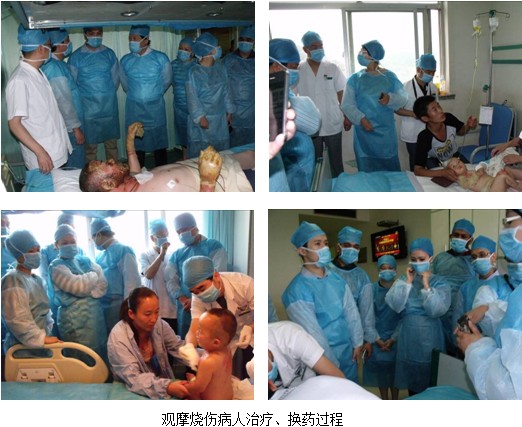 6月19日上午9點(diǎn),15位醫(yī)生被分成兩組,分別由舒葉主任和張美艷帶領(lǐng)參觀延安大學(xué)附屬醫(yī)院燒傷整形科病房??剖业睦钪魅魏蜅钪魅螌?duì)來訪客人分別進(jìn)行引導(dǎo)和講解,學(xué)習(xí)了大面積燒傷的治療,規(guī)范化的換藥,暴露療法,半暴露,及包扎療法的應(yīng)用,微粒皮種植技術(shù)的展示。參觀中,醫(yī)生們對(duì)換藥頻率,止疼藥及抗生素的使用,細(xì)菌培養(yǎng),療法適應(yīng)癥,見效的時(shí)間,疤痕防治,疤痕膏導(dǎo)入儀,按摩手法等都表示出了極大的興趣,兩位主任也詳細(xì)介紹了從急救,補(bǔ)液到防疤治療等局部到系統(tǒng)治療的具體事宜。幾位大面積燒傷患者的高質(zhì)量的創(chuàng)面愈合讓馬來醫(yī)生們感到欣慰和感嘆。應(yīng)醫(yī)生們的要求,院方安排了骨科病房的參觀,醫(yī)生們學(xué)習(xí)了再生技術(shù)在骨科領(lǐng)域的應(yīng)用,讓幾位骨科醫(yī)生興奮不已。