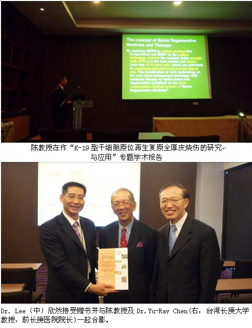 Dr. Lee在聽完陳教授的報(bào)告后激動(dòng)的說:“我們新加坡總醫(yī)院20年前完成了國際上第個(gè)MEBO的臨床實(shí)驗(yàn),當(dāng)時(shí)的100多例在臨床上取得了與其它方法一樣滿意的效果,我們當(dāng)時(shí)知道美寶會(huì)有神奇的效果,但不知道其原因是什么,現(xiàn)在聽了你的報(bào)告,這是干細(xì)胞原位再生的結(jié)果!這是很令人振奮的!我對(duì)你們K19的實(shí)驗(yàn)很感興趣,如果除了免疫熒光外,還有其它的實(shí)驗(yàn)數(shù)據(jù)就更好了,希望美寶發(fā)展的更好!”他在會(huì)后欣然接受了陳教授所贈(zèng)徐榮祥教授的專著Burns Regenerative Medicine and Therapy. 并表示希望能與美寶有更好地合作,也請(qǐng)美寶團(tuán)隊(duì)轉(zhuǎn)達(dá)對(duì)徐榮祥教授的誠摯問候!