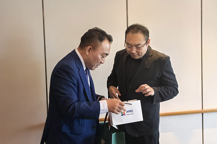 會后,雙方互贈具有深厚APEC淵源的紀(jì)念禮品。 李成宇副會長向徐鵬主席贈送了韓國2025年APEC領(lǐng)導(dǎo)人峰會官方紀(jì)念幣套裝。徐鵬主席則回贈了美寶燒傷膏(韓國在售版本)以及MIAGE高端護膚品套裝。這兩份回贈禮品均承載著往屆APEC的印記:MIAGE產(chǎn)品是2023年美國舊金山APEC領(lǐng)導(dǎo)人峰會官方禮品袋的重要成員;而美寶燒傷膏則是2024年秘魯利馬APEC領(lǐng)導(dǎo)人峰會的官方禮品之一。此次互贈,不僅體現(xiàn)了雙方的情誼,更巧妙地串聯(lián)起歷屆APEC峰會的深厚淵源。
