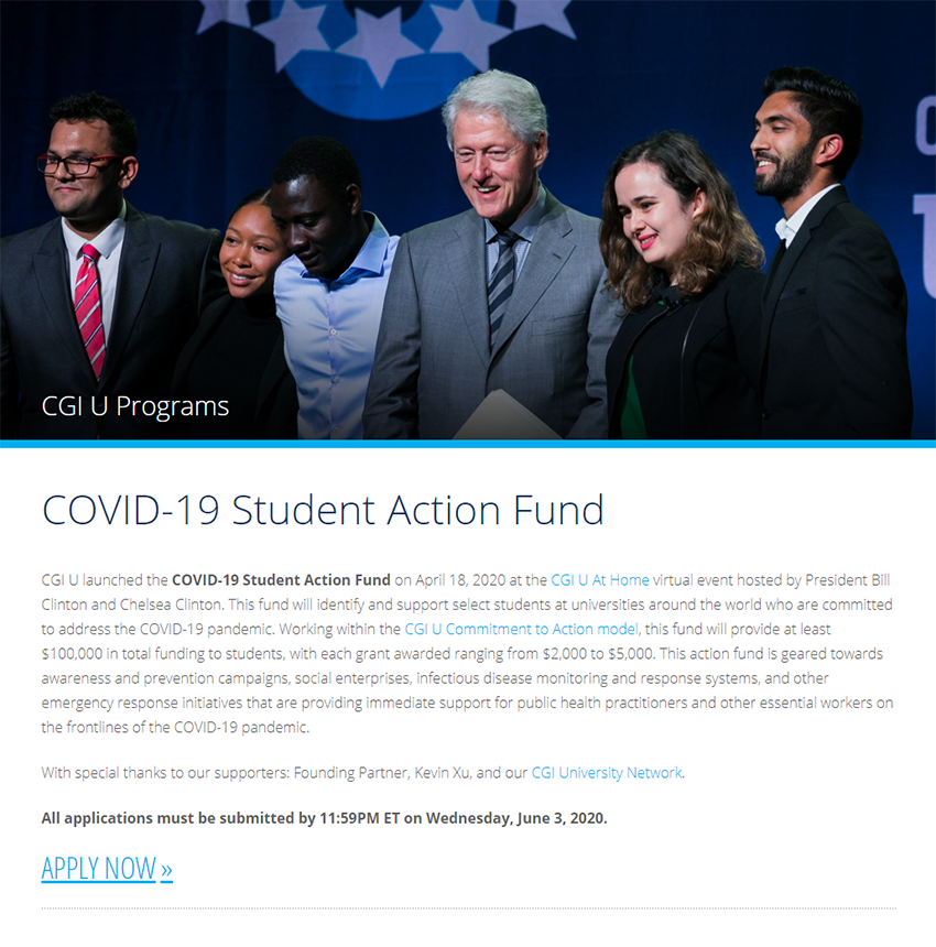 通過CGIU 的行動(dòng)承諾模式,”新冠病毒學(xué)生行動(dòng)基金”將為大學(xué)生提供至少10萬美元的總資助,每筆資助的金額從2000到5000美元不等。克林頓表示特別感謝這一項(xiàng)目的聯(lián)合創(chuàng)始人徐鵬(Kevin Xu )以及CGIU 的大學(xué)網(wǎng)絡(luò)系統(tǒng)。他表示這項(xiàng)基金非常重要,并對徐鵬的長期支持表示了贊賞。