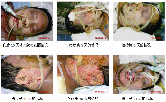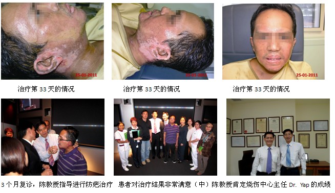 2010年11月,醫(yī)院收治了一例從外院轉來的汽油深度燒傷合并并嚴重吸入性損傷的患者(TBSA=22%,深II度—淺III度),該患者是一名29歲的工程師,是在工作中被燒傷的,且燒傷部位主要集中在頭面部和雙上肢等重要功能部位和影響容貌的部位。為了使患者得到更好的恢復容貌和肢體的功能,醫(yī)院決定采用再生醫(yī)學技術治療治療這例大面積嚴重燒傷患者,同時,為了更有把握地救治好該患者,燒傷整形中心的主任Dr. Yap Lok Huei馬上與中國燒傷創(chuàng)瘍科技中心的陳永翀主任取得了聯(lián)系,陳教授通過電話和電子郵件對該患者進行了治療指導,醫(yī)院燒傷中心的醫(yī)護人員全程采用燒傷再生醫(yī)學技術對患者進行規(guī)范的治療。經過33天的規(guī)范治療,患者的所有深度燒傷創(chuàng)面不需要植皮全部實現(xiàn)燒傷皮膚原位再生愈合的臨床效果。以下是頭、面、頸部深度燒傷早期的再生愈合情況和愈合后3個月隨訪的情況: