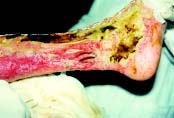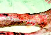 1. 小腿脛骨下段燒傷創(chuàng)面的表現(xiàn)。