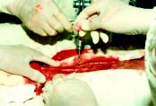 4. 用骨鉆在骨面按間隔1厘米鉆孔,鉆孔深度達髓質(zhì),有微出血。