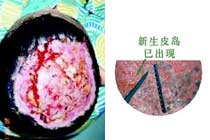 4. MEBT治療22天,肉芽連成片狀,表面新生上皮組織皮島出現(xiàn)。
