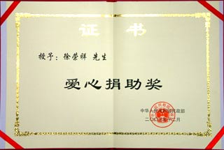 徐榮祥先生榮獲民政部授予的“愛(ài)心捐助獎(jiǎng)”