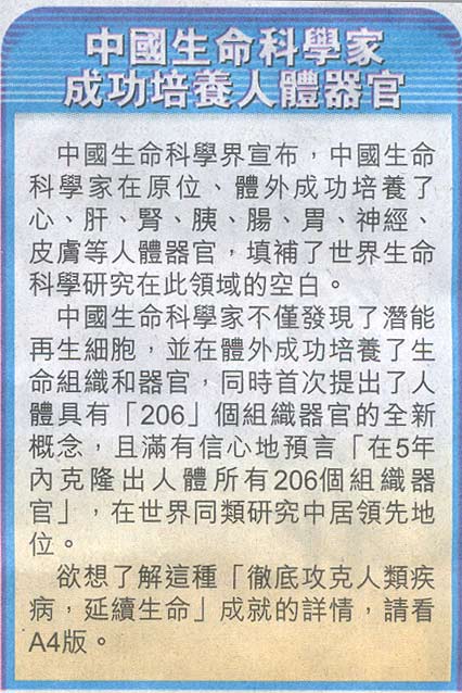 ~者按Q?003q??日,是全世界喜迎新年的日子,q一?《香港商报》以大量文字和图片资料对我集团在生命U学领域获得的重大突破性进展进行了(jin)专题报道。报道中详细介绍?jin)破解hcȝ命gl之谜的探烦(ch)Q以大量实验囄QŞ象地展示?jin)体外再生复制h体组l器官的研究成果。昭C着宝国际集团在生命科学领域内已经掀开?jin)崭新的一,势必在新的一q中取得更加令世人瞩目的成就Q?/p>