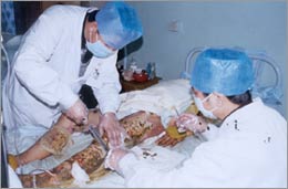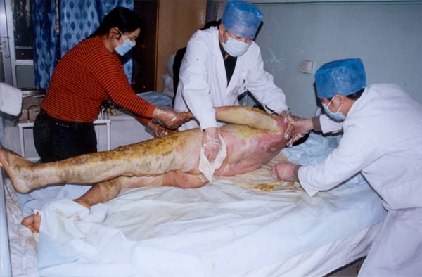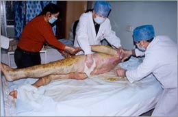 數(shù)九嚴(yán)冬的北國(guó)之城——牡丹江市,銀裝素裹、北風(fēng)呼嘯、寒氣刺骨,但牡市一院燒傷科病房?jī)?nèi)卻是溫暖四溢、異常忙碌,這溫暖來(lái)自于醫(yī)護(hù)人員的工作熱情,來(lái)自于每個(gè)醫(yī)護(hù)人員高度責(zé)任感的片片愛(ài)心! 自從突發(fā)事故致農(nóng)民劉明福被全身燙傷(總面積90%)送至牡丹江市人民醫(yī)院燒傷科救治后,20多個(gè)晝夜,醫(yī)護(hù)人員和來(lái)自北京的中國(guó)燒傷創(chuàng)瘍科技中心臨床部的胡棟才主任一起奮戰(zhàn)在病房,每天在室溫32°C的環(huán)境中工作6小時(shí)以上,大家不怕苦、不怕累、不怕臟、不怕臭,不分白晝與黑夜、沒(méi)有節(jié)假日,全部的精力、時(shí)間都投入到搶救工作中,共同的目的只有一個(gè),一定要使大面積特重度燙傷患者劉明福早日康復(fù)!