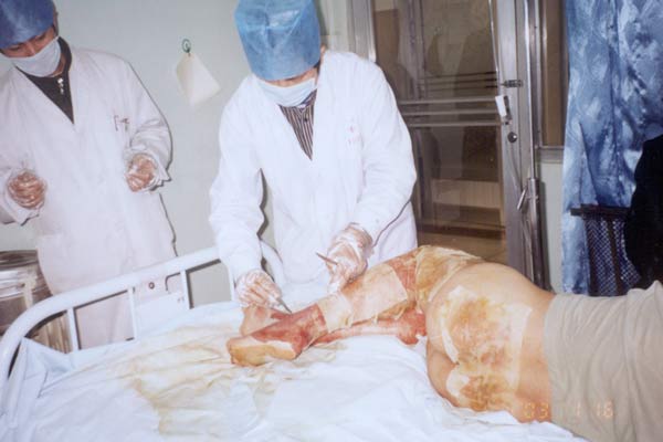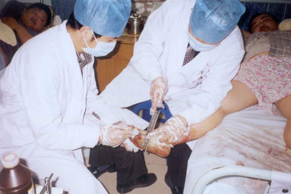 一陣急促的電話鈴震驚了牡丹江市一院燒傷科,“我是醫(yī)院急診科,120急診救護(hù)車很快要送6名燙傷傷員到你科,請(qǐng)盡快做好接收傷員的準(zhǔn)備工作! 接到作戰(zhàn)命令后,正在牡市一院指導(dǎo)大面積燒傷患者救治的北京中國燒傷創(chuàng)瘍科技中心臨床部主任胡棟才教授立即組織燒傷科全體醫(yī)護(hù)人員迅速準(zhǔn)備病房,鋪好病床,藥品到位,做好了一切救護(hù)前的準(zhǔn)備工作。 事故發(fā)生在2003年1月14日16時(shí)50分,北國的冬天早已夜幕降臨,上班族的人們匆匆趕路下班回家,突然牡丹江市某條大街的一條直徑一米多的供熱主管道發(fā)生大爆炸,只聽到一聲巨響后,瞬間熱浪升上天空,高達(dá)7層樓,地面廢水四溢約2尺多深,此時(shí)正逢6人路經(jīng)此地段,加之熱氣浪使人伸手不見5指,只好摸索著趟廢水逃離現(xiàn)場(chǎng),造成6人被沸水燙傷。 隨著120急救車的陣陣鳴笛聲,劃破北國寒冷漆黑的夜空,急速向牡丹江市第一人民醫(yī)院急馳,直奔住院部大樓。