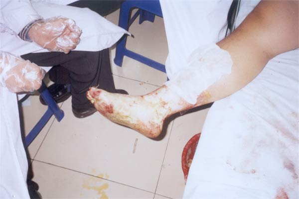 全體醫(yī)護(hù)人員在緊張有序地工作著。經(jīng)數(shù)小時(shí)行之有效的處置后,在濕潤(rùn)燒傷膏的作用下,各患者創(chuàng)面不痛了,也不呻吟了,患者親屬的急躁情緒也穩(wěn)定下來了,病房又恢復(fù)了昔日的平靜。此時(shí)時(shí)鐘已指向了凌晨3時(shí)20分,但醫(yī)護(hù)人員的搶救工作仍在有條不紊地進(jìn)行。又是一個(gè)不眠之夜...... 這就是我們醫(yī)護(hù)工作者的神圣職責(zé),這就是美寶人救死扶傷的工作精神!各位患者親屬看在眼里,感激不盡,高度贊揚(yáng)醫(yī)護(hù)人員救死扶傷的工作精神,高度贊揚(yáng)濕性醫(yī)療技術(shù)給他們的親人帶來治療上的福音! 又訊:這兩天,又有兩名患兒因開水燙傷致頭面部及軀干、四肢部大面積燙傷,例一:江浩,男,1歲2個(gè)月,燙傷總面積27%,均為深二度及三度創(chuàng)面;劉俊,男,1歲5個(gè)月,燙傷面積23%,均為深二度及三度燙傷。二例患兒均全程用濕性醫(yī)療技術(shù)治療。 中國燒傷創(chuàng)瘍科技中心臨床部報(bào)道