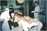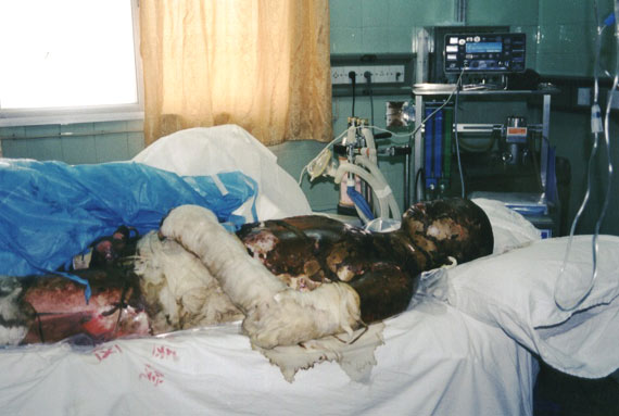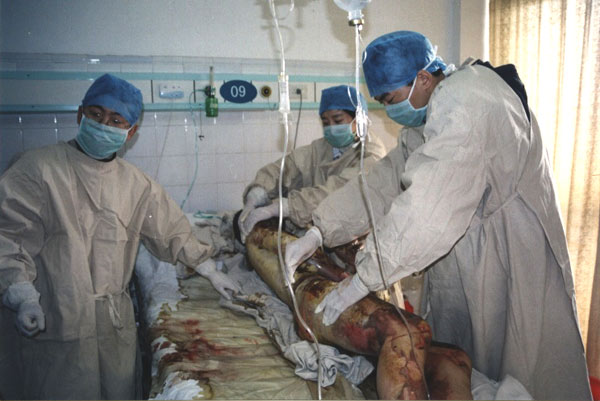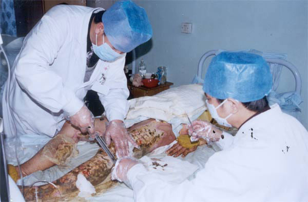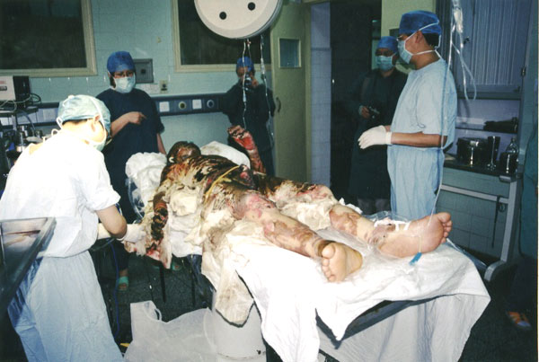 2003年4月2日,江蘇南通市中醫(yī)院燒傷外科正在進(jìn)行著一場生命爭奪戰(zhàn):一個燒傷面積達(dá)92%,三度達(dá)72%(深三度達(dá)35%)的特大面積特重度燒傷患者仰臥在特護(hù)床上,生命垂危,由醫(yī)院領(lǐng)導(dǎo)總動員,大外科主任姚祖仁主持協(xié)調(diào)成立了以燒傷科趙賢忠主任掛帥的搶救小組,立即對病人進(jìn)行靜脈切開置管建立有效的輸液通道進(jìn)行抗休克復(fù)蘇治療、創(chuàng)面簡單清創(chuàng)后行外涂美寶濕潤燒傷膏暴露療法,同時應(yīng)用抗生素和支持療法等一系列搶救措施以糾正休克和內(nèi)環(huán)境紊亂,防治感染和各種嚴(yán)重并發(fā)癥,由護(hù)理部選派優(yōu)秀護(hù)士進(jìn)行特護(hù)、監(jiān)測病情……