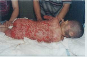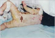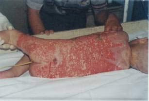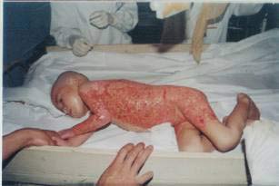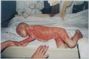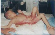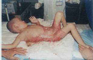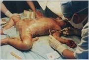 2003年4月26日,中國(guó)燒傷創(chuàng)瘍柳鋼科技醫(yī)療中心接到一個(gè)來(lái)自市中醫(yī)院的求救電話:“我院收治的一例大面積特重度燒傷患兒,病情惡化,生命垂危,請(qǐng)您們前來(lái)會(huì)診!”,此事引起柳鋼醫(yī)院陳永翀副院長(zhǎng)的高度重視,立即安排專(zhuān)車(chē)并派出了由經(jīng)驗(yàn)豐富的李世斌副主任醫(yī)師帶隊(duì)的會(huì)診搶救小組,趕赴市中醫(yī)院。經(jīng)過(guò)會(huì)診了解到,該患兒名叫方曉敏,女,3歲,廣西來(lái)賓市人。在4月16日不慎跌入沸水鍋內(nèi)而燙傷全身,一分多鐘才被家人抱起,哭鬧不安;純簜蠹胰巳f(wàn)分著急,曾先后到廣西來(lái)賓市人民醫(yī)院、158醫(yī)院、柳州市中醫(yī)院救治,但效果都不好,特別是最近幾日患兒反復(fù)出現(xiàn)精神差、煩躁、高熱、腹脹、全身腫脹、心率快、呼吸困難等病情惡化表現(xiàn),患兒父母更是擔(dān)心焦急。李醫(yī)師會(huì)診后,如實(shí)地將病情向家屬說(shuō)明,并將柳鋼燒傷中心的實(shí)力告知家屬,考慮到市中醫(yī)院的條件有限,果斷作出轉(zhuǎn)院搶救的決定,并立即組織患兒轉(zhuǎn)院。 患兒轉(zhuǎn)入柳鋼燒傷治療中心后,陳永翀副院長(zhǎng)親臨一線組織指揮搶救,同時(shí)成立了搶救小組、特護(hù)小組全面展開(kāi)搶救。入院檢查:體溫39.8攝氏度,脈搏178次/分,呼吸65次/分,血壓80/46mmHg。神志淡漠,精神差,全身浮腫,鼻翼扇動(dòng),呼吸困難,兩肺聞及濕性羅音,心音細(xì)速,心率178次/分,腹部膨隆,腸鳴音減弱,燒傷創(chuàng)面位于左上肢、胸腹部、腰背部、臀部會(huì)陰部和雙大腿,呈蠟黃色,痛覺(jué)消失,腫脹明顯,創(chuàng)周潮紅。輔助檢查:血?dú)夥治觯篜H 7.095,Pco224.6mmHg,Po263.6mmHg,BE-20.6;血常規(guī):WBC28.5×109/L,N80%,Hb87g/L;電解質(zhì):K+3.15,Cl-119.2,Ca++2.97;腎功能:Ur12.42,Cr159(mmol/L),血總蛋白55g/L,尿Pr(++),霉菌(+++),大便霉菌(+++),血細(xì)菌培養(yǎng):肺炎克雷伯菌,創(chuàng)面痂皮培養(yǎng):肺炎克雷伯菌。轉(zhuǎn)入診斷:①大面積特重度燒傷合并重度感染膿毒血癥(TBSA≈50%,深I(lǐng)I度15%,III度35%);②急性左心衰肺水腫,肺功能不全重度低氧血癥;③重度水、電解質(zhì)、酸堿失衡;④多器官功能障礙;⑤貧血、低蛋白血癥。