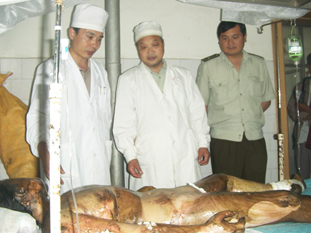 在患者入院的一個(gè)小時(shí)后,中國(guó)燒傷創(chuàng)瘍科技中心臨床總部主任王洪生在美寶集團(tuán)河南片區(qū)總經(jīng)理趙俊國(guó)的陪同下也來(lái)到了周口市長(zhǎng)城燒傷醫(yī)院,當(dāng)王主任得知該院剛收治一例大面積燒傷患者后,立即在該院院長(zhǎng)李長(zhǎng)明、副院長(zhǎng)金黨軍、燒傷科主任趙以祥及燒傷科的全體醫(yī)護(hù)人員陪同下,深入病房,查看病人,指導(dǎo)對(duì)該患者的搶救,并就創(chuàng)面襯墊物的選擇,大面積燒傷休克期要避動(dòng)、保暖、簡(jiǎn)單清創(chuàng)、吸氧、強(qiáng)心、保腎、適當(dāng)輸液(寧少勿多)等治療要點(diǎn)向在場(chǎng)的醫(yī)護(hù)人員進(jìn)行了認(rèn)真?zhèn)魇凇?