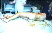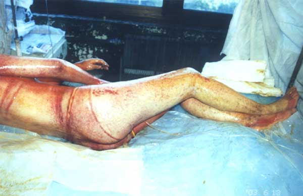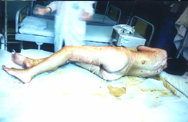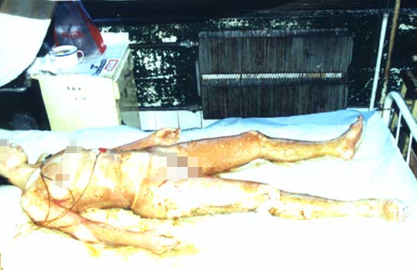 2003年6月10日0時20分,四川省廣元市急救中心燒傷科急診轉(zhuǎn)入一例大面積燒傷患者。該患者,女,34歲,紡織工人,以“全身被紡漿燒傷1小時余”為主訴急診入院,入院時查體:體溫:37.5℃,脈搏:88次/分,呼吸:25次/分,神志清楚,查體合作,除頭、面、頸及零散的胸腹部未被燒傷外,全身其余部分均為燒傷創(chuàng)面,入院診斷:全身紡漿燒傷總面積86%TBSA(淺二度6%,深二度40%,三度40%),入院后創(chuàng)面處理采用MEBT/MEBO,結(jié)合積極有效復(fù)蘇補(bǔ)液抗休克、全身應(yīng)用廣譜高效抗菌素、臟器功能保護(hù)等全身綜合治療,患者入院后,為保證該患者的成功救治,該院燒傷科主任王懷奇一直與中國燒傷創(chuàng)瘍科技中心臨床總部主任王洪生保持熱線聯(lián)系,在王洪生主任前期電話會診與指導(dǎo)下,目前患者已進(jìn)入傷后六天,病情穩(wěn)定,各項(xiàng)生化指標(biāo)基本在正常范圍,深二度及三度創(chuàng)面已開始液化,患者正在進(jìn)一步治療中。
