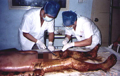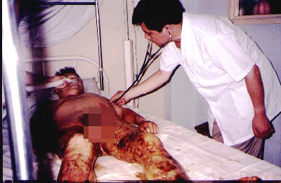 2003年6月20日凌晨一時,安徽省寧國市人民醫(yī)院外一科病房里的寧靜被一陣急促的腳步聲和呼救聲打破--"救救他吧,醫(yī)生!"原來是一位50歲的男性民工不慎跌入含30%磷酸的工業(yè)沸水池內(nèi),致使全身右上肢,雙下肢,臀部及會陰燒燙傷總面積達54%,其中淺三度10%,深三度達44%。值班醫(yī)生與?漆t(yī)生立即進行救治,兩路補液,擴容,改善微循環(huán),糾酸,抗炎及支持治療等。患者較平穩(wěn)地度過了休克期。
