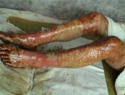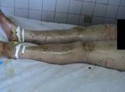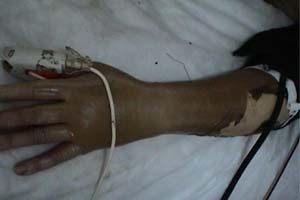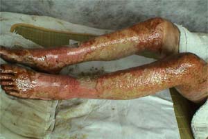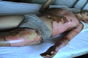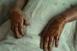 2003年7月20日,一陣陣刺耳的救護(hù)警報(bào)伴著炙人的酷暑,一家三口被液化氣嚴(yán)重?zé)齻幕颊弑凰腿牒幽夏详枱齻t(yī)療中心: 患者甲:46歲,全身多處燒傷TBSA18%,深Ⅱ度,中度燒傷。 患者乙:女,52歲,全身嚴(yán)重?zé)齻鸗BSA93%,入院診斷:⑴特重度燒傷,⑵重度休克,⑶重度吸入性損傷。 患者丙:男,35歲,全身多處燒傷,TBSA53%,深Ⅲ度傷,入院診斷:⑴特重讀燒傷,⑵中度休克,⑶輕度吸入性損傷,⑷暴震傷。 中國燒傷創(chuàng)瘍醫(yī)療中心的河南南陽燒傷醫(yī)療分中心(南石醫(yī)院)的醫(yī)護(hù)人員冒著40℃的高溫,迅速組織搶救治療,利用成熟的“燒傷濕性醫(yī)療技術(shù)”伴防瘢痕醫(yī)療對三位患者進(jìn)行救治。截至8月7日,患者甲已痊愈出院。20日,患者丙的創(chuàng)面已基本痊愈,準(zhǔn)備辦理出院手續(xù), 27日,患者乙的部分創(chuàng)面已完全封閉,進(jìn)入穩(wěn)定的康復(fù)狀態(tài)。
