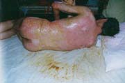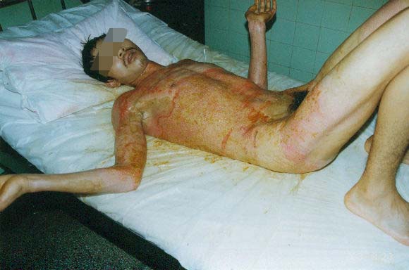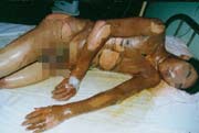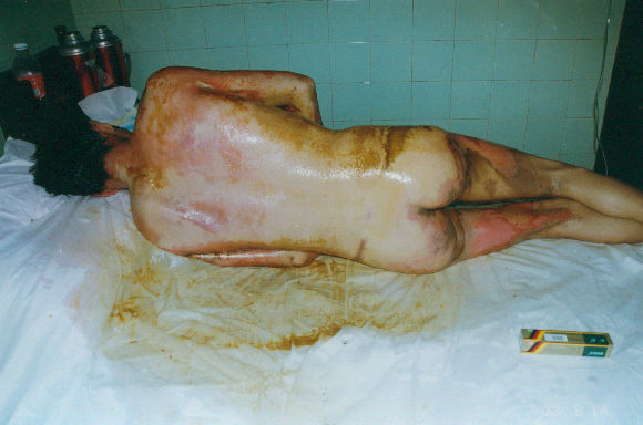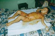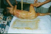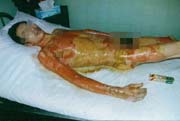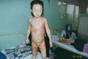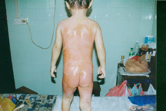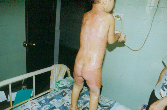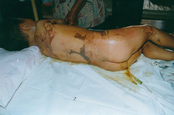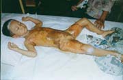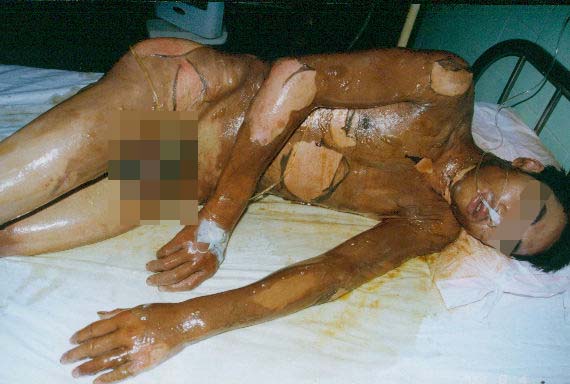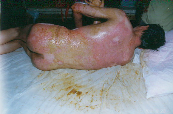 2003年7月24日及8月4日以來,廣東省開平市第一人民醫(yī)院燒傷科采用燒傷皮膚再生醫(yī)療技術(shù)分別治愈一例小兒和一例成人大面積燒傷: 病例一、患兒男,4歲,因"全身多處沸水燙傷伴疼痛16小時"為主訴于2003年7月24日入院;入院時查體,T:38.5℃,P:96次/分,R:24次/分,軀干、會陰、臀部及雙大腿見大片燙傷創(chuàng)面,絕大部分創(chuàng)面表皮脫落,腹部小部分創(chuàng)面潮紅,感覺過敏,其余大部分創(chuàng)面紅白相間,少量滲出,入院診斷:全身多處沸水燙傷45%TBSA(淺二度5%、深二度40%);特重度。