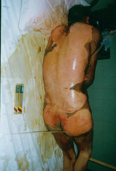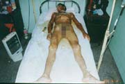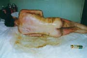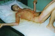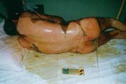 病例二、患者男,26歲,因"周身多處沸水燙傷伴疼痛1小時"為主訴于2003年8月4日急診入院;入院時查體,T:37℃,P:88次/分,R:24次/分,Bp:130/85mmHg,四肢部分創(chuàng)面大水皰形成,基底潮紅,感覺過敏,其余創(chuàng)面見少量小水皰形成,部分皰皮脫落,基底蒼白,感覺遲鈍,少量滲出;入院診斷:全身多處沸水燙傷60%TBSA(淺二度10%、深二度50%);特重度。