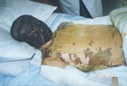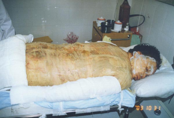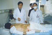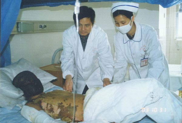 2003年10月27日,是一個陽光燦爛、秋高氣爽的日子,人們盡情地沐浴著陽光的溫暖,欣賞著大地的秋色。然而也是此日,對于湖南省瀏陽市某花炮廠來說,又是一個很不幸的日子。這天,由于天氣干燥,煙花廠的工人在制作煙花裝藥時不慎引起火藥爆炸,造成該車間的5名工人全部燒傷。 大火無情人有情,事故發(fā)生后,眾人一面滅火,一面從火海中將5名工人救出,并由"120"救護(hù)車迅速送到瀏陽市中醫(yī)院的中國燒傷創(chuàng)瘍科技中心瀏陽醫(yī)療分中心救治。 5名重癥燒傷患者送到醫(yī)院后,被早在等候的全院領(lǐng)導(dǎo)和有關(guān)醫(yī)護(hù)人員迅速抬入燒傷科,并組織了以該院業(yè)務(wù)副院長羅其美副主任醫(yī)師、燒傷科戴淼生副主任醫(yī)師為主的搶救小組,并決定對這批大面積特重度燒傷伴有呼吸道燒傷的患者全部采用由生命科學(xué)家徐榮祥教授發(fā)明的"燒傷皮膚再生醫(yī)療技術(shù)"救治。該院醫(yī)護(hù)人員在積極搶救傷員的同時,羅副院長緊急向中國燒傷創(chuàng)瘍科技中心求援,請求派專家到瀏陽指導(dǎo)救治。 中國燒傷創(chuàng)瘍科技中心領(lǐng)導(dǎo)接到求援報告后,當(dāng)即電話指示派出正在江蘇省與各三甲醫(yī)院領(lǐng)導(dǎo)、醫(yī)護(hù)人員交流講學(xué)的臨床部胡棟才主任,火速趕到湖南省瀏陽市中醫(yī)院指導(dǎo)救治。 傷情就是命令,刻不容緩,胡棟才主任接到通知后,立即背起行囊,踏上南下的列車,并一路電話聯(lián)系,提出搶救方案。經(jīng)過27個小時火車、汽車的顛簸,日夜兼程于10月28日深夜23時50分趕到瀏陽中醫(yī)院。下車后,胡棟才主任顧不上一路長途跋涉的疲勞,直奔燒傷科診察各傷員傷情,安撫傷員親屬,制定救治措施。 5名燒傷傷員中,有3名是全身大面積特重度燒傷,并伴有不同程度的呼吸道燒傷。 例1:唐某某,男性,23歲,全身燒傷總面積92%(淺二度13%,深二度24%,淺三度33%,深三度22%);伴呼吸道燒傷。 例2:晏某某,男性,27歲,全身燒傷總面積91%(淺二度6%,深二度16%,淺三度46%,深三度23%),伴呼吸道燒傷。 例3:唐某,女性,43歲,全身燒傷總面積65%(淺二度15%,深二度27%,淺三度18%,深三度11%),伴有呼吸道燒傷。 其余2例傷員全身燒傷總面積分別為32%和41%,均為深二度~淺三度。 胡棟才主任查看傷情后,認(rèn)真聽取了戴主任對各傷員傷情的匯報及輔助檢查結(jié)果,根據(jù)仔細(xì)分析傷情,果斷做出了如下?lián)尵却胧?/p> 一、 積極補(bǔ)液抗休克,并根據(jù)每小時尿量及時調(diào)整補(bǔ)液速度,嚴(yán)防補(bǔ)液過多造成肺水腫,使之平穩(wěn)度過休克期。 二、 2例大面積特重度燒傷患者因出現(xiàn)高熱(T:39.7攝氏度),為防爆發(fā)性敗血癥的發(fā)生,抗生素的應(yīng)用調(diào)整到高效、廣普及足量。 三、 例2的晏某某出現(xiàn)呼吸困難,給予靜滴肺腦合劑,并行氣管切開。 四、 糾正水電介質(zhì)、酸堿平衡的紊亂,并注意藥物擴(kuò)容,使之改善微循環(huán)。 五、 注意糾正低蛋白血癥。 六、 注意心、腦、肺、腎、肝等臟器的維護(hù)。 七、 積極處理創(chuàng)面,除外用濕潤燒傷膏保護(hù)外,對淺三度創(chuàng)面耕耘,深三度創(chuàng)面切開減壓,使之改善局部微循環(huán)。 八、 加強(qiáng)靜脈置管、氧氣管、導(dǎo)尿管等護(hù)理,并注意保暖和密切觀察病情變化,隨時處置。 經(jīng)過幾晝夜的共同戰(zhàn)斗、積極的搶救,現(xiàn)5例患者已經(jīng)轉(zhuǎn)危為安,病情穩(wěn)定,各患者精神好、食欲佳,各項輔助檢查數(shù)據(jù)基本正常。但是,醫(yī)護(hù)人員都深知,這僅僅是萬里長征邁出了第一步,更艱巨的攻堅戰(zhàn)還等待著去打響。搶救小組的全體醫(yī)護(hù)人員有信心、有決心將這批患者從死亡線上奪回來,使他們領(lǐng)略到世界最前沿的先進(jìn)技術(shù)--皮膚再生醫(yī)療技術(shù)帶給他們的福音!讓皮膚再生醫(yī)療技術(shù)在譽(yù)滿世界的煙花之鄉(xiāng)--瀏陽地區(qū)結(jié)出豐碩的果實! 中國燒傷創(chuàng)瘍科技中心臨床部
