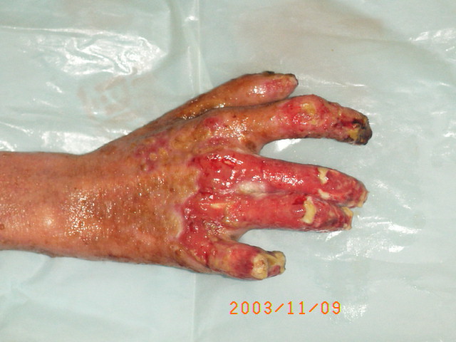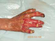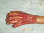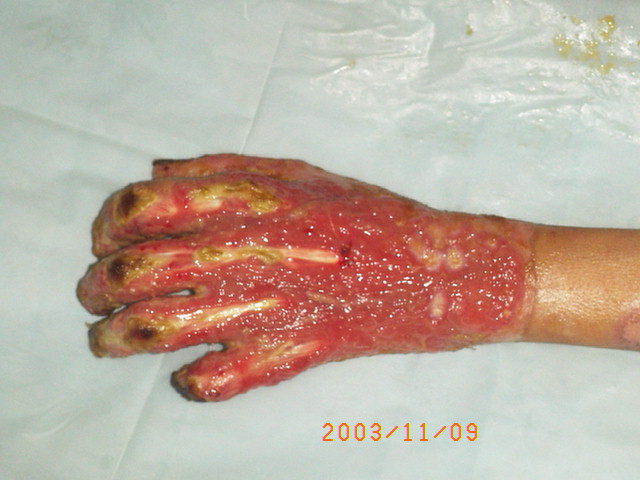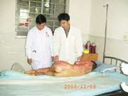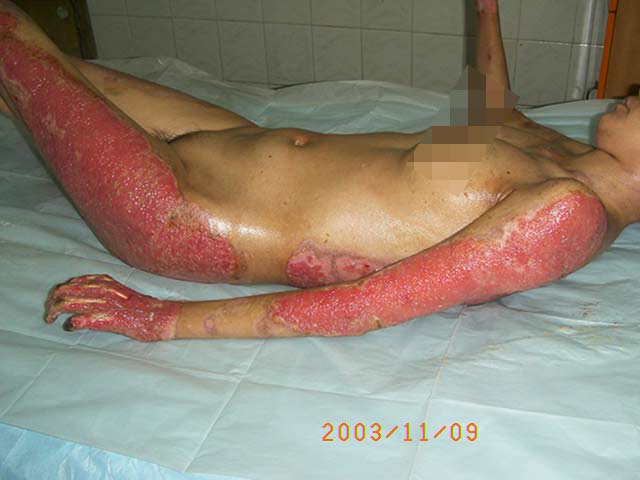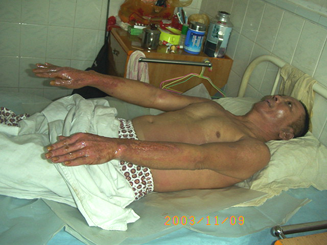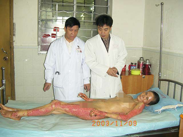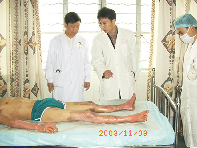 2003年10月13日,廣東省河源市人民醫(yī)院收治了一批水泥大面積燒傷病人,創(chuàng)面處理全程應(yīng)用我國著名生命科學(xué)家徐榮祥教授發(fā)明的燒傷皮膚再生醫(yī)療技術(shù),結(jié)合全身綜合治療,該批大面積燒傷患者已平穩(wěn)通過了休克期、感染期、順利渡過修復(fù)期,病程已進(jìn)入傷后一個月,所有患者淺二度和深二度創(chuàng)面已愈合,病例3、病例4、病例5全身所有燒傷創(chuàng)面已愈合,病例2除右小腿外側(cè)有部分三度燒傷創(chuàng)面未愈(但其創(chuàng)面上有多數(shù)皮島生長)外,全身其它部分燒傷創(chuàng)面已痊愈,病例1的左側(cè)上、下肢深三度創(chuàng)面因已進(jìn)入傷后一個月,無明顯皮島生長,為縮短病程,已行植皮手術(shù)封閉創(chuàng)面,現(xiàn)已是術(shù)后三天,患者生命體征穩(wěn)定。 在此期間中國燒傷創(chuàng)瘍科技中心臨床總部主任王洪生曾先后于2003年10月13日—17日、2003年10月22日—26日和2003年11月8日—10日三下廣東河源市人民醫(yī)院全程跟蹤指導(dǎo)對該批大面積燒傷患者的救治工作,確保了該批患者的成功救治,目前,該批患者已基本康復(fù)。