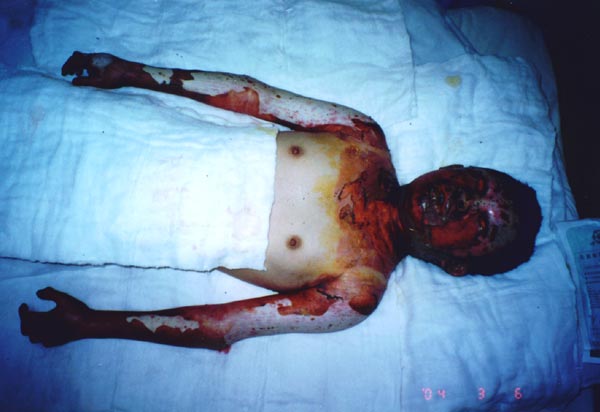 會(huì)后,大理州人民醫(yī)院燒傷科的專家看到燒傷皮膚再生醫(yī)療技術(shù)非常理想的臨床效果,在本次學(xué)術(shù)活動(dòng)剛結(jié)束就邀請(qǐng)王主任到該醫(yī)院為一名正在該院住院的小兒大面積深度燒傷患兒會(huì)診。王主任接到會(huì)診請(qǐng)求后,立即趕到了該院,聽(tīng)取了主治大夫?qū)純旱牟∏榻榻B,并深入病房對(duì)患兒進(jìn)行了細(xì)致的體檢,患兒,女,14歲,于2004年3月3日晚11時(shí),因蠟燭引燃被褥致全身多處被火焰燒傷,傷后7小時(shí)轉(zhuǎn)入大理州人民醫(yī)院燒傷科,入院診斷:1、全身火焰燒傷總面積45%TBSA(深二度25%BSA、三度20%BSA);2、中度吸入性損傷。王主任從對(duì)患兒體檢判斷,該患兒雙上肢基本為三度創(chuàng)面、面部的一部分和雙下肢部分創(chuàng)面也為三度創(chuàng)面,體檢后,王主任親自帶領(lǐng)該病人的主治醫(yī)生給該患兒的雙上肢和面部等三度創(chuàng)面進(jìn)行了無(wú)創(chuàng)性耕耘減張術(shù),并且于清創(chuàng)術(shù)后給患兒創(chuàng)面涂用了美寶濕潤(rùn)燒傷膏,換藥結(jié)束后,王主任還就對(duì)該患兒下一步的創(chuàng)面和全身綜合治療等方面與患兒的主治醫(yī)生進(jìn)行了交流。