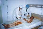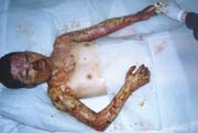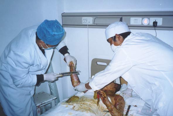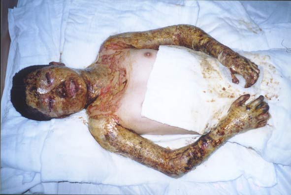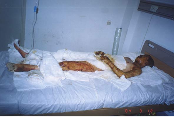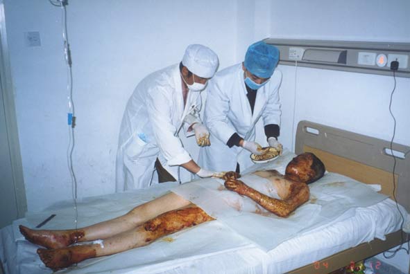 20004年3月4日,云南省大理州人民醫(yī)院收治一例小兒大面積燒傷患兒;該患兒,女,14歲,以"火焰全身多處燒傷7小時(shí)"為主訴于2004年3月4日晚11時(shí)急診收入大理州人民醫(yī)院燒傷整形科,入院診斷:1、全身火焰燒傷總面積45%TBSA(深二度25%BSA、三度20%BSA);2、中度吸入性損傷。