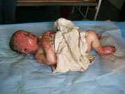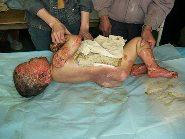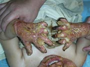 另外,王主任在河源講學期間,還于2004年3月22日應邀到河源市人民醫(yī)院燒傷外科進行教學查房、為5名慕名而來的疤痕患者進行會診,并對正在該院治療的一例小兒大面積燒傷患兒下一步的治療進行了臨床指導和會診,該患兒、男、4歲,以"火焰致全身多處燒傷5小時"為主訴于2004年3月11日急診入院,入院診斷:全身燒傷總面積37%TBSA(深二度25%、三度12%);入院后該院對該患兒創(chuàng)面處理全程應用MEBT/MEBO,結合抗休克、抗感染、營養(yǎng)支持等全身綜合治療,傷后11天,除體溫有波動外,患兒精神狀態(tài)正常、胃腸道功能良好、心率、呼吸平穩(wěn),深二度創(chuàng)面壞死組織已液化排除,三度創(chuàng)面壞死組織也基本被清除,面部三度肉芽創(chuàng)面已可見多數(shù)皮島生長,給患兒進行詳細體檢和復習病歷后,王主任指出對該患兒下一步治療的重點是對其三度創(chuàng)面未液化脫落的壞死組織要盡快清除,同時要注意加強營養(yǎng)支持療法和據(jù)情調整抗生素防止創(chuàng)面及全身膿毒癥的發(fā)生。 中國燒傷創(chuàng)瘍科技中心臨床部