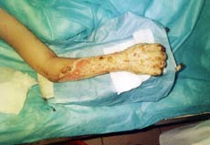 2004年5月17日,應(yīng)藍(lán)天醫(yī)院的邀請(qǐng),中國(guó)燒傷創(chuàng)瘍科技中心陳主任趕到該院,對(duì)此患者進(jìn)行會(huì)診。查房檢查:患者生命體征正常,一般情況良好,心、肺無(wú)異常。創(chuàng)面分布在右手和右前臂,掌側(cè)較淺創(chuàng)面已愈合,前臂背側(cè)創(chuàng)面壞死組織大部分清除干凈,燒傷深達(dá)脂肪深層,部分創(chuàng)面已見新生長(zhǎng)的粉紅色組織,手背仍有部分壞死組織,并有肌腱、指骨壞死,燒傷深度達(dá)骨骼,手指能輕度屈伸,指端血循環(huán)良好,燒傷創(chuàng)面周圍皮膚顏色正常。診斷:右手、右前臂熱壓傷,TBSA=5%,淺II度2%,深I(lǐng)II度3%。查房結(jié)束后,陳主任示范和指導(dǎo)大家進(jìn)行燒傷再生醫(yī)療技術(shù)的創(chuàng)面規(guī)范操作,結(jié)合工作實(shí)踐介紹III度燒傷的治療經(jīng)驗(yàn),制定了下一階段的治療計(jì)劃,同時(shí)向大家做了"患者知情權(quán)"的普法宣傳。大家認(rèn)為要給患者充分的知情權(quán)和選擇權(quán),決心應(yīng)用好再生醫(yī)療技術(shù),給患者一次再生修復(fù)的機(jī)會(huì),減輕患者的痛苦、減少患者的創(chuàng)傷、減少殘疾,造;颊、家庭和社會(huì)。 中國(guó)燒傷創(chuàng)瘍科技中心