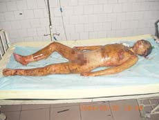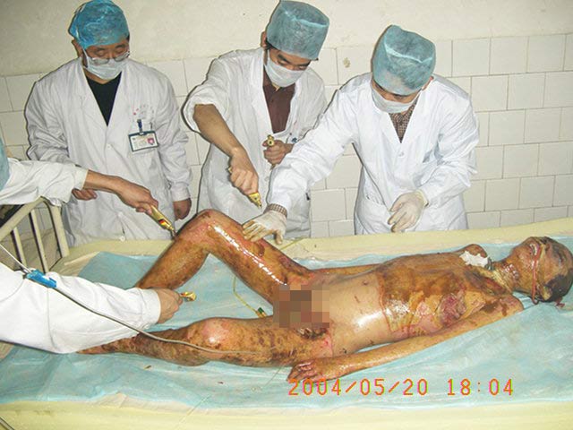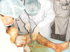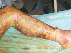 GLO:20g/L。因該患者病情危重,該院特邀請(qǐng)中國燒傷創(chuàng)瘍科技中心臨床總部主任王洪生前來會(huì)診,王主任于2004年5月20日上午11時(shí)趕到該院。王主任到達(dá)該院后,在聽取該患者的經(jīng)治醫(yī)生陳士平副主任醫(yī)師對(duì)該患者的病情介紹后,首先深入病房為該患者進(jìn)行的體檢后,又親自為該患者創(chuàng)面換藥以進(jìn)一步觀察創(chuàng)面情況,當(dāng)日下午3時(shí),王主任又在由該院燒傷外科全體醫(yī)生和護(hù)士長參加的對(duì)該患者的病例討論會(huì)上,對(duì)該患者的診斷進(jìn)行了修正:王主任指出,結(jié)合患者病史、體檢和實(shí)驗(yàn)室檢查等情況,該患者因病情危重及復(fù)合傷,免疫力低下而引發(fā)早期全身膿毒癥,結(jié)合目前患者體溫波動(dòng)于39℃以上,心率127次/分,呼吸32次/分,血培養(yǎng)兩次結(jié)果都有同一細(xì)菌生長,考慮患者全身膿毒癥還未控制,另外,該患者目前存在嚴(yán)重的低蛋白血癥;聽診雙肺呼吸音清晰,未聞干濕性啰音,下一步治療首先要調(diào)整抗生素控制全身膿毒癥,加強(qiáng)營養(yǎng)支持療法,加緊清理前胸和雙下肢Ⅲ度創(chuàng)面壞死組織,加強(qiáng)褥瘡護(hù)理,對(duì)氣管插管先行堵管試驗(yàn),而后盡快拔管以在發(fā)肺部并發(fā)癥,對(duì)深靜脈插管要加強(qiáng)消毒措施,為防導(dǎo)管全身膿毒癥的發(fā)生,必要時(shí)要及時(shí)拔管并更換深靜脈插管部位,病例討論后,王主任又帶領(lǐng)該院燒傷外科的醫(yī)生再次為該患者前胸和雙下肢Ⅲ度創(chuàng)面進(jìn)行清創(chuàng)和換藥,以向他們展示燒傷皮膚再生醫(yī)療技術(shù)中規(guī)范的Ⅲ度創(chuàng)面壞死組織處理技術(shù)-壞死組織薄化技術(shù);當(dāng)日晚上8時(shí),王主任又應(yīng)邀在該院燒傷外科醫(yī)生辦公室利用筆記本電腦圖文并茂的向該院燒傷外科的專家和醫(yī)務(wù)人員講述燒傷皮膚再生醫(yī)療技術(shù)在大面積深度燒傷的臨床應(yīng)用和治療要點(diǎn),并向他們介紹了我國著名生命科學(xué)家、醫(yī)學(xué)家徐榮祥教授近期在再生醫(yī)學(xué)領(lǐng)域所取得的重大臨床和實(shí)驗(yàn)研究成果,同時(shí)還向他們通報(bào)了徐教授主編的"燒傷再生醫(yī)學(xué)與療法"英文版專著,已由世界最著名的醫(yī)學(xué)、生物學(xué)、生命科學(xué)領(lǐng)域的瑞典KARGER出版社正式出版,在世界范圍內(nèi)發(fā)行這一重大喜訊。目前患者正在進(jìn)一步救治療中。