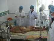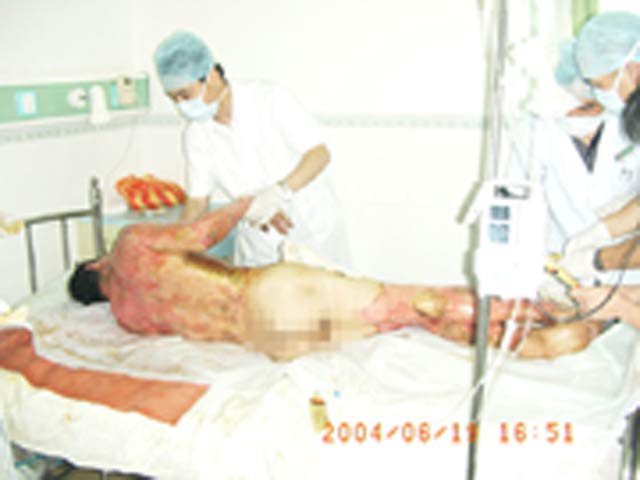 2004年6月10日晚8時30分,廣東省中山市三鄉(xiāng)醫(yī)院燒傷外科急診收入一例成人大面積燒傷患者。該患者男,32歲,以“煤氣罐爆炸燒傷全身多處1小時”為主訴急診入院。患者于入院前1小時,因宿舍內(nèi)煤氣泄露引起煤氣罐爆炸致全身多處燒傷;入院時查體:T:37.3℃,P:100次/分,R:22次/分,BP:120/60mmHg,神清,急性痛苦病容,呻吟不止,煩躁不安,全身多處創(chuàng)面呈黑褐色,滿布油污,部分頭發(fā)、眉毛被燒焦,頭、面、頸、前后軀干大部分及四肢皮膚廣泛水腫,創(chuàng)面散在大小不等的水皰,部分腐皮脫失,創(chuàng)基紅白相間,入院診斷:全身煤氣火焰燒傷總面積80%TBSA(淺二度35%、深二度45%)特重度燒傷;患者入院后,該院對其創(chuàng)面處理全程采用燒傷皮膚再生醫(yī)療技術(shù),結(jié)合抗休克、抗感染、營養(yǎng)支持等全身綜合治療,患者病情基本穩(wěn)定,淺二度創(chuàng)面已愈合,但近日患者開始出現(xiàn)高熱,為確保對該患者的成功救治,該院向中國燒傷創(chuàng)瘍科技中心臨床總部主任王洪生發(fā)出了會診請求,王主任接到會診請求后,于2004年6月19日下午四時趕到該院為該患者會診,到達(dá)該院后,王主任首先聽取了該院燒傷外科主任傅尚凱副教授、副主任醫(yī)師等專家及相關(guān)醫(yī)務(wù)人員對該患者的病情介紹,隨后,王主任又在傅主任等燒傷外科專家和醫(yī)務(wù)人員的陪同下,深入病房為該患者進(jìn)行了詳細(xì)的體檢,并親自為該患者進(jìn)行清創(chuàng)換藥,向該院燒傷外科專家及醫(yī)務(wù)人員展示燒傷皮膚再生醫(yī)療技術(shù)中規(guī)范的清創(chuàng)換藥技術(shù),接下來,在該院燒傷外科醫(yī)生辦公室王主任與該院燒傷外科的全體醫(yī)生就該患者下一步的創(chuàng)面規(guī)范化處理、調(diào)整抗生素以加強(qiáng)抗感染治療、營養(yǎng)支持及臟器功能保護(hù)等全身綜合治療要點(diǎn)進(jìn)行了討論,會診結(jié)束前,王主任還就燒傷皮膚再生醫(yī)療技術(shù)在大面積燒傷中的臨床應(yīng)用、在再生醫(yī)學(xué)領(lǐng)域所取得的重大臨床及實(shí)驗(yàn)研究成果等問題與該院燒傷外科的專家及相關(guān)醫(yī)務(wù)人員進(jìn)行了廣泛而深入的交流。