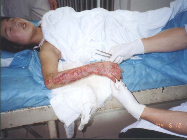 | 2004年5月21日,報(bào)道了河北省廊坊市藍(lán)天醫(yī)院(燒燙傷專(zhuān)科醫(yī)院)應(yīng)用燒傷皮膚再生醫(yī)療技術(shù)救治一名18歲右前臂右手背深I(lǐng)II度熱壓燒傷患者。經(jīng)過(guò)46天(傷后55天)的治療,患者目前的情況怎么樣了?深I(lǐng)II度的熱壓燒傷創(chuàng)面怎么應(yīng)用燒傷再生療法處理?治療的效果怎么樣?與傳統(tǒng)的干燥外科植皮療法相比有什么優(yōu)點(diǎn)?這些應(yīng)該是大家非常關(guān)心和關(guān)注的問(wèn)題。事實(shí)勝于雄辯,F(xiàn)在,讓我們把這名患者的治療經(jīng)過(guò)、治療結(jié)果,結(jié)合各階段的照片資料給大家做一個(gè)詳細(xì)的介紹。 這是一名從甘肅到河北打工的18歲女青年,于5月4日在工作中右手及右前臂不慎被卷入約250。C的烘紙機(jī)中而發(fā)生燒傷和擠壓傷,熱源接觸時(shí)間約3分鐘。傷后住進(jìn)了當(dāng)?shù)啬晨h醫(yī)院進(jìn)行治療,病情得到初步控制,但是,因傷情較重、處理難度較大,于5月12日(傷后第8天)轉(zhuǎn)到廊坊市藍(lán)天燒燙傷專(zhuān)科醫(yī)院進(jìn)一步救治。