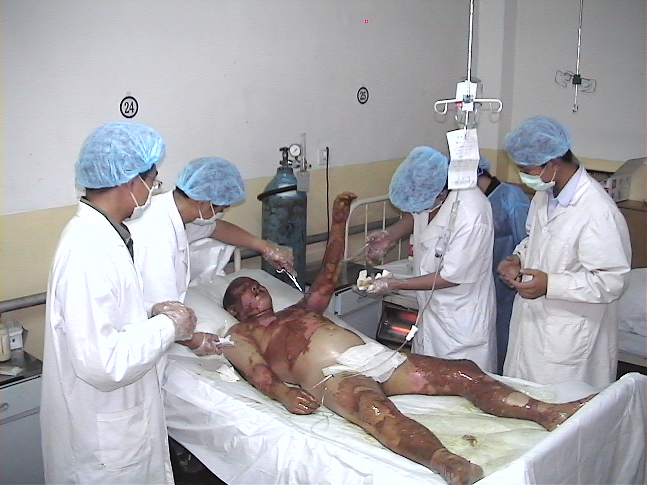 2004年9月4日13時許,石家莊化工化纖有限公司職工賈某因工作時不慎從五米高處摔下,跌入電石(乙炔氣)爐中,造成全堿燒傷,患者非常痛苦,呻吟不安,單位領(lǐng)導(dǎo)及同事家屬焦慮萬分,約四十分鐘后,由120急救車急送井陘礦務(wù)局醫(yī)院,井陘礦務(wù)局醫(yī)院接到急救通知后,早已嚴(yán)陣以待,緊急組織了以程二鎖院長、高保廷主任、潘紹田醫(yī)師及護理人員的搶救小組,做好了一切接受傷員的準(zhǔn)備工作。約13時30分,傷員急診入院,入住該院外二科ICU病房,入院時初步診斷:全身大面積特重度化學(xué)燒傷,面積達(dá)成87%,(深Ⅱ度—深Ⅲ度)即給予積極補充血溶量等抗休克救治,創(chuàng)面采用燒傷皮膚再生醫(yī)療技術(shù)全程外用濕潤燒傷膏行濕潤暴露治療。 傷后第二天,患者發(fā)生全身侵襲性感染,患者所在單位領(lǐng)導(dǎo)及醫(yī)院程院長急向北京中國燒傷創(chuàng)瘍科技中心求援,該中心迅速派出具有豐富的大面積燒傷患者救治經(jīng)驗的臨床部主任胡棟才前往救援。胡主任于當(dāng)天晚上20時到達(dá)醫(yī)院后,立即聽取病情匯報,深入病房查看病情,查閱所有輔助檢查結(jié)果,發(fā)現(xiàn)血常規(guī):白細(xì)胞總數(shù)由13×109下降到5×109,血小板147×109下降至78×109,肝功能見谷丙轉(zhuǎn)氨酶高達(dá)362u/L,結(jié)合病人精神差,腹脹明顯,體溫:39.5℃ 呼吸淺快:36次/分 心率快134次/分 口唇紫紺, 創(chuàng)面發(fā)紫并見片狀出血點等綜合考慮,認(rèn)為患者已發(fā)生敗血癥及并發(fā)肝臟,心臟等臟器功能受損,胡主任當(dāng)機立斷,調(diào)整救治方案:給予高效、足量抗生素抗感染,加強心、腦、肺、腎、肝等多器官的維護及加強創(chuàng)面的處理等。經(jīng)上述搶救措施后,患者生命體征平穩(wěn)。 |