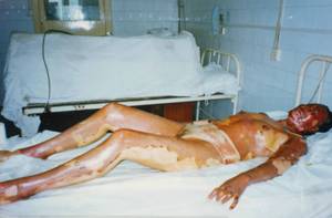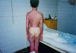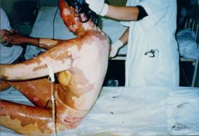 事情經(jīng)過是這樣的:2004年9月6日晚上11時,53歲的羅某某正在廚房煮東西時,不慎發(fā)生煤氣爆燃并引燃了身上的衣物而將全身燒傷。傷后約半小時,羅某被送到了桂林市第四人民醫(yī)院燒傷治療中心,值班醫(yī)師陳熙馬上對患者進行診治,經(jīng)檢查:患者皮膚除了三角內褲的區(qū)域和足底外,其他部位均被不同程度燒傷,其中雙手、雙上肢、腰背部、雙下肢背側的燒傷深度較深,表現(xiàn)為:表皮脫落,部分紅白相間,部分呈蠟白色,腫脹滲出少,痛覺喪失。入院診斷:大面積特重度燒傷(89%TBSA,淺II度59%、深II度25%、III度淺型5%)。 患者入院后,燒傷治療中心的古風主任和李潔護士長馬上趕到病房,組織展開搶救治療,唐建東業(yè)務院長聞訊后也趕到病房組織指揮搶救。由于治療方法正確,護理措施到位,患者平穩(wěn)、順利地度過了休克期。在創(chuàng)面修復期,全科人員積極主動配合,按照規(guī)范的燒傷皮膚再生醫(yī)療技術規(guī)范處理創(chuàng)面,同時注重心理治療和護理,消除了患者對不良預后的疑慮,增強了戰(zhàn)勝疾病的信心,使得患者積極配合治療和護理。 |