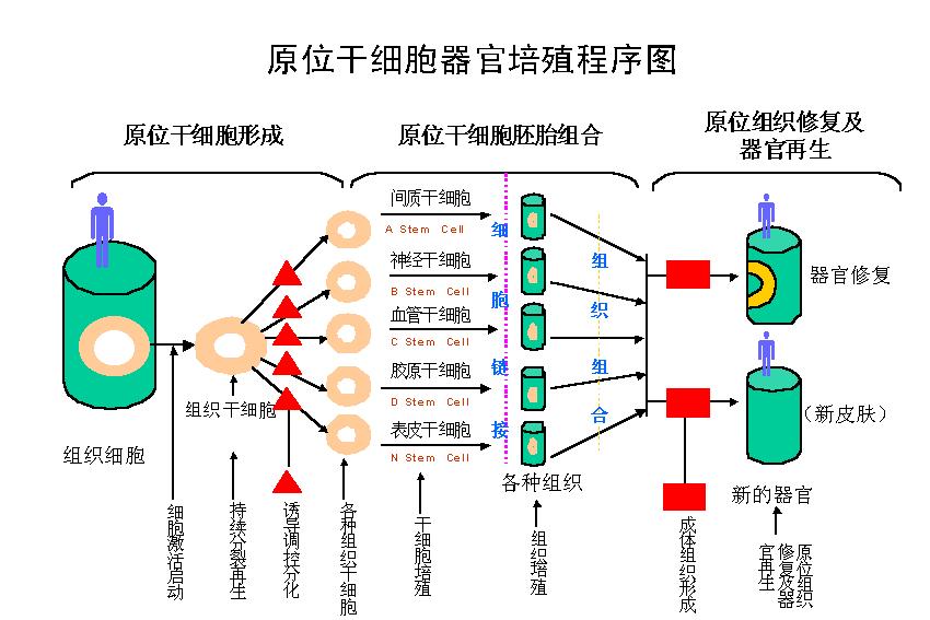 由徐榮祥主持的研究報(bào)告所公布的成果是激動(dòng)人心的,他繪制的圖譜所揭示的細(xì)胞在完成損傷肌體組織修復(fù)過(guò)程中的演變規(guī)律是一個(gè)分化整合的過(guò)程。首先,當(dāng)肌體受損傷時(shí),肌體原位活細(xì)胞啟動(dòng)并變?yōu)槌审w干細(xì)胞,這使細(xì)胞傳代增殖和定向分化有了可能;其次,成體干細(xì)胞經(jīng)過(guò)誘導(dǎo),進(jìn)一步定向分化,出現(xiàn)多種組織干細(xì)胞,這些組織干細(xì)胞為進(jìn)一步共同參與組織修復(fù)作準(zhǔn)備;而后,多種組織干細(xì)胞以及它們所形成的組織進(jìn)一步鏈接;最后,多種新生組織再組合成功能組織及器官,并完成目標(biāo)組織的修復(fù)和器官的原位復(fù)制。